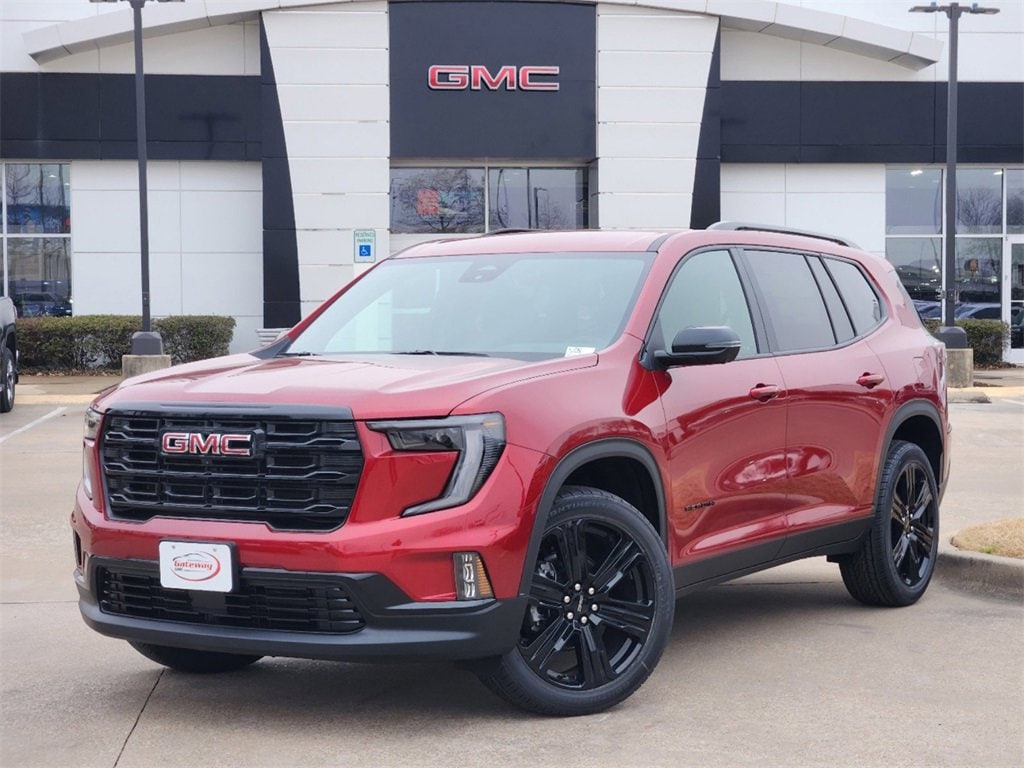 Volcanic Red Tintcoat 2025 GMC Acadia 4D Sport Utility Elevation FWD 8-Speed Automatic 2.5L DOHC Black Edition (Gloss Black Roof Rails, Performance Suspension, and Wheels: 22 x 8.5 Gloss Black Aluminum), Elevation Premium Package (3-Channel Programmable Universal Home Remote, 6-Way Power Front Passenger Seat Adjuster, 7-Passenger Seating (2-2-3 Seating Configuration), Auto-Dimming Inside Rear-View Mirror, CoreTec Seat Trim, Front Passenger Power Lumbar Seat Adjuster, and Wheels: 20 x 8 Bright Silver Aluminum), Floor Liner Package (LPO) (1st & 2nd Row All-Weather Floor Liner (LPO) and 3rd Row All-Weather Floor Liner (LPO)), Preferred Equipment Group 4SC, FWD, After Dark Cloth, 12 Speakers, 18 x 7.5 Aluminum Wheels, 2-Way Driver Power Lumbar Seat Adjuster, 3.49 Final Drive Axle Ratio, 3rd row seats: split-bench, 4-Way Manual Front Passenger Seat Adjuster, 4-Wheel Disc Brakes, 8-Passenger Seating (2-3-3 Seating Configuration), 8-Way Power Driver Seat Adjuster, ABS brakes, Air Conditioning, Alloy wheels, AM/FM radio: SiriusXM with 360L, Apple CarPlay/Android Auto, Auto High-beam Headlights, Auto-dimming Rear-View mirror, Automatic temperature control, Bodyside moldings, Bose Premium 12-Speaker System w/Sub-Woofer, Brake assist, Bumpers: body-color, Cloth Seat Trim, Compass, Delay-off headlights, Driver door bin, Driver vanity mirror, Dual front impact airbags, Dual front side impact airbags, Electronic Stability Control, Emergency communication system: OnStar Services capable, Exterior Parking Camera Rear, Four wheel independent suspension, Front anti-roll bar, Front Bucket Seats, Front Center Armrest, Front dual zone A/C, Front fog lights, Front License Plate Bracket, Front reading lights, Fully automatic headlights, Heated door mirrors, Heated Driver & Front Passenger Seats, Heated front seats, Heated steering wheel, Illuminated entry, Leather steering wheel, Low tire pressure warning, Navigation System, Occupant sensing airbag, Outside temperature display, Overhead airbag, Overhead console, Panic alarm, Passenger door bin, Passenger vanity mirror, Power door mirrors, Power driver seat, Power Liftgate, Power steering, Power windows, Radio data system, Radio: 15 Premium GMC Infotainment System, Rear air conditioning, Rear anti-roll bar, Rear reading lights, Rear seat center armrest, Rear side impact airbag, Rear window defroster, Rear window wiper, Remote keyless entry, Security system, SiriusXM w/360L, Speed control, Speed-sensing steering, Split folding rear seat, Spoiler, Sport steering wheel, Steering wheel mounted audio controls, Tachometer, Telescoping steering wheel, Tilt steering wheel, Traction control, Trip computer, Turn signal indicator mirrors, Variably intermittent wipers, and Voltmeter.