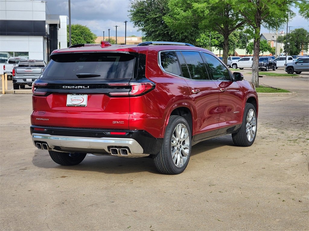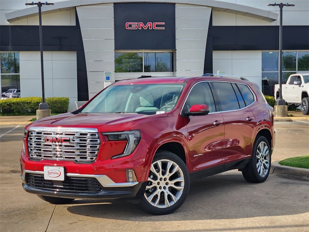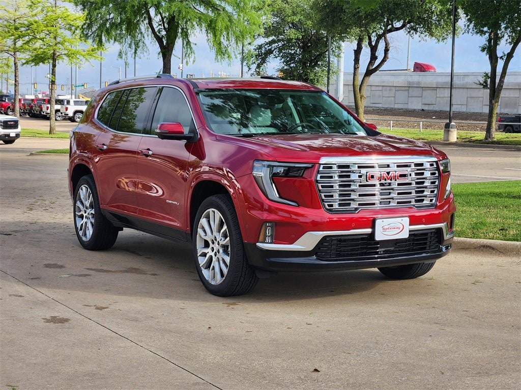 Volcanic Red Tintcoat 2025 GMC Acadia 4D Sport Utility Denali FWD 8-Speed Automatic 2.5L DOHC Denali Reserve Package (Bose Performance 16-Speaker System w/Sub-Woofer, Panoramic Power Sunroof w/Sunshade, and Performance Suspension), Memory Package, Preferred Equipment Group 5SA, Super Cruise Package (Driver Attention Assist, Enhanced Automatic Parking Assist, Rear Camera Mirror, and Super Cruise), FWD, Sheer/Very Dark Atmosphere Leather, 12 Speakers, 3.49 Final Drive Axle Ratio, 3rd Row 60/40 Power Split-Folding Bench, 3rd row seats: split-bench, 4-Wheel Disc Brakes, 6-Way Power Front Passenger Seat Adjuster, 7-Passenger Seating (2-2-3 Seating Configuration), 8-Way Power Driver Seat Adjuster, ABS brakes, Air Conditioning, Alloy wheels, AM/FM radio: SiriusXM with 360L, Apple CarPlay/Android Auto, Auto High-beam Headlights, Auto-dimming door mirrors, Auto-dimming Rear-View mirror, Automatic temperature control, Black Wheel Lug Nuts (LPO), Bodyside moldings, Bose Premium 12-Speaker System w/Sub-Woofer, Brake assist, Bumpers: body-color, Compass, Delay-off headlights, Driver 4-Way Power Lumbar Seat Adjuster, Driver door bin, Driver vanity mirror, Dual front impact airbags, Dual front side impact airbags, Electronic Stability Control, Emergency communication system: OnStar Services capable, Exterior Parking Camera Rear, Four wheel independent suspension, Front anti-roll bar, Front Bucket Seats, Front Center Armrest, Front dual zone A/C, Front fog lights, Front License Plate Bracket, Front Passenger 4-Way Power Lumbar Seat Adjuster, Front reading lights, Fully automatic headlights, Garage door transmitter, Genuine wood console insert, Genuine wood dashboard insert, Genuine wood door panel insert, Heads-Up Display, Heated & Ventilated Driver & Front Passenger Seats, Heated door mirrors, Heated Driver & Front Passenger Seats, Heated front seats, Heated rear seats, Heated steering wheel, Illuminated entry, Leather steering wheel, Low tire pressure warning, Memory seat, Navigation System, Occupant sensing airbag, Outside temperature display, Overhead airbag, Overhead console, Panic alarm, Passenger door bin, Passenger vanity mirror, Perforated Leather-Appointed Seat Trim, Power door mirrors, Power driver seat, Power Liftgate, Power passenger seat, Power steering, Power windows, Radio data system, Radio: 15 Premium GMC Infotainment System, Rain sensing wipers, Rear air conditioning, Rear anti-roll bar, Rear reading lights, Rear side impact airbag, Rear window defroster, Rear window wiper, Remote keyless entry, Security system, SiriusXM w/360L, Speed control, Speed-sensing steering, Split folding rear seat, Spoiler, Sport steering wheel, Steering wheel memory, Steering wheel mounted audio controls, Tachometer, Telescoping steering wheel, Tilt steering wheel, Traction control, Trip computer, Turn signal indicator mirrors, Variably intermittent wipers, Ventilated front seats, Voltmeter, Wheels: 20 x 8 Pearl Nickel Machined Aluminum, and Wheels: 22 x 8.5 Pearl Nickel Machined Alum (DISC)