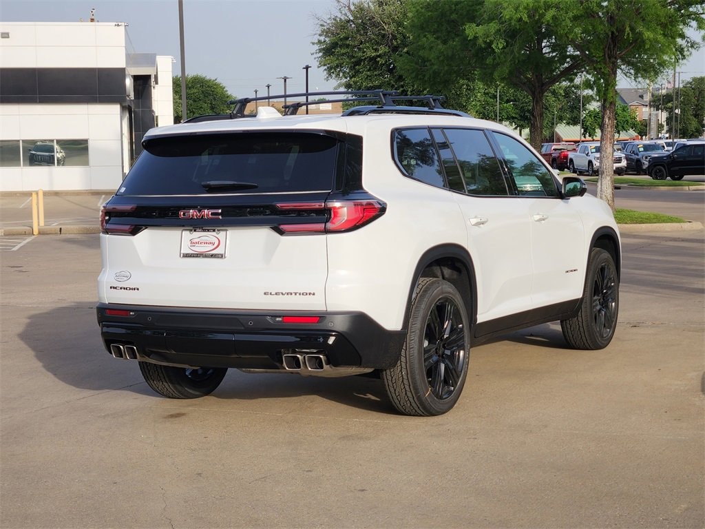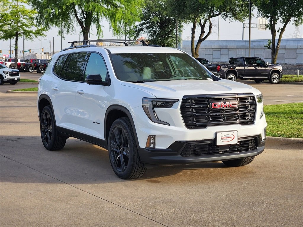 Summit White 2025 GMC Acadia 4D Sport Utility Elevation FWD 8-Speed Automatic 2.5L DOHC Black Edition (Gloss Black Roof Rails, Performance Suspension, and Wheels: 22 x 8.5 Gloss Black Aluminum), Elevation Premium Package (3-Channel Programmable Universal Home Remote, 6-Way Power Front Passenger Seat Adjuster, 7-Passenger Seating (2-2-3 Seating Configuration), Auto-Dimming Inside Rear-View Mirror, CoreTec Seat Trim, Front Passenger Power Lumbar Seat Adjuster, and Wheels: 20 x 8 Bright Silver Aluminum), Preferred Equipment Group 4SC, FWD, Gray Cloth, 12 Speakers, 18 x 7.5 Aluminum Wheels, 2-Way Driver Power Lumbar Seat Adjuster, 3.49 Final Drive Axle Ratio, 3rd row seats: split-bench, 4-Way Manual Front Passenger Seat Adjuster, 4-Wheel Disc Brakes, 8-Passenger Seating (2-3-3 Seating Configuration), 8-Way Power Driver Seat Adjuster, ABS brakes, Air Conditioning, Alloy wheels, AM/FM radio: SiriusXM with 360L, Apple CarPlay/Android Auto, Auto High-beam Headlights, Auto-dimming Rear-View mirror, Automatic temperature control, Black Wheel Lug Nuts (LPO), Bodyside moldings, Bose Premium 12-Speaker System w/Sub-Woofer, Brake assist, Bumpers: body-color, Cloth Seat Trim, Compass, Delay-off headlights, Driver door bin, Driver vanity mirror, Dual front impact airbags, Dual front side impact airbags, Electronic Stability Control, Emergency communication system: OnStar Services capable, Exterior Parking Camera Rear, Four wheel independent suspension, Front anti-roll bar, Front Bucket Seats, Front Center Armrest, Front dual zone A/C, Front fog lights, Front License Plate Bracket, Front reading lights, Fully automatic headlights, Heated door mirrors, Heated Driver & Front Passenger Seats, Heated front seats, Heated steering wheel, Illuminated entry, Leather steering wheel, Low tire pressure warning, Navigation System, Occupant sensing airbag, Outside temperature display, Overhead airbag, Overhead console, Panic alarm, Passenger door bin, Passenger vanity mirror, Power door mirrors, Power driver seat, Power Liftgate, Power steering, Power windows, Radio data system, Radio: 15 Premium GMC Infotainment System, Rear air conditioning, Rear anti-roll bar, Rear reading lights, Rear seat center armrest, Rear side impact airbag, Rear window defroster, Rear window wiper, Remote keyless entry, Roof Cross Rails, Security system, SiriusXM w/360L, Speed control, Speed-sensing steering, Split folding rear seat, Spoiler, Sport steering wheel, Steering wheel mounted audio controls, Tachometer, Telescoping steering wheel, Tilt steering wheel, Traction control, Trip computer, Turn signal indicator mirrors, Variably intermittent wipers, and Voltmeter.