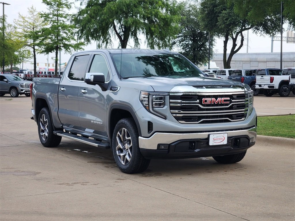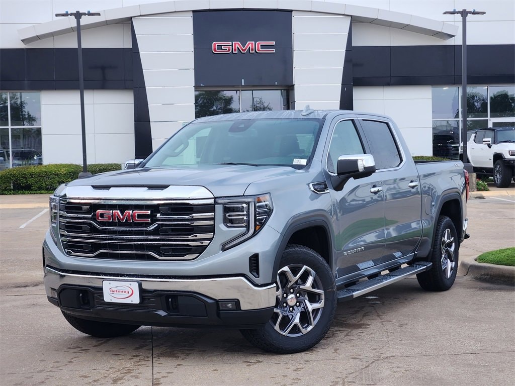 Sterling Metallic 2025 GMC Sierra 1500 4D Crew Cab SLT 4WD 10-Speed Automatic EcoTec3 5.3L V8 High Capacity Suspension Package, Preferred Equipment Group 4SA (120-Volt Bed Mounted Power Outlet, 120-Volt Interior Power Outlet, 170 Amp Alternator, 2 Charge/Data USB Ports, 2 Type-C Charge-Only Rear USB Ports, 6-Speaker Audio System Feature, Auto-Locking Rear Differential, Auxiliary External Transmission Oil Cooler, Chrome Header & Chrome Grille Insert Bars, Color-Keyed Carpeting Floor Covering, Deep-Tinted Glass, Electric Rear-Window Defogger, Front Frame-Mounted Black Recovery Hooks, Front Rain-Sensing Wipers, HD Rear Vision Camera, Integrated Trailer Brake Controller, Keyless Open & Start, LED Cargo Area Lighting, Manual Tilt-Wheel & Telescoping Steering Column, OnStar Services Capable, Perimeter Lighting, Power Door Locks, Power Front Passenger Windows w/Express Up/Down, Power Front Windows w/Driver Express Up/Down, Power Rear Windows w/Express Down, Push Button Start, Rear Wheelhouse Liners, Remote Vehicle Starter System, SiriusXM w/360L Trial Subscription, Steering Wheel Audio Controls, Theft Deterrent System (Unauthorized Entry), and Wi-Fi Hotspot Capable), SLT Convenience Package (2 Charge/Data USB Ports Inside Center Console, Electronic Precision Shift, Floor-Mounted Center Console, Front Bucket Seats, Power Rake & Telescoping Steering Column, Premium Bose 7-Speaker Sound System, Ventilated Driver & Front Passenger Seats, and Wireless Charging), SLT Preferred Package (Adaptive Cruise Control, Heated 2nd Row Outboard Seats, Power Sliding Rear Window w/Rear Defogger, and Universal Home Remote), Standard Suspension Package, Texas Edition SLT Premium Package (20 Polished Aluminum Wheels, Chrome Wheel To Wheel Assist Steps, and Texas Edition Badging), Trailering Package (Hitch Guidance), X31 Off-Road Package (Dual Exhaust System, Heavy-Duty Air Filter, Hill Descent Control, Off-Road Suspension, and X31 Hard Badge), 10-Speed Automatic, 4WD, Black Leather, 10-Way Power Driver Seat Adjuster w/Lumbar, 10-Way Power Passenger Seat Adjuster w/Lumbar, 3.23 Rear Axle Ratio, 4-Wheel Disc Brakes, 6 Speakers, ABS brakes, Air Conditioning, Alloy wheels, AM/FM radio: SiriusXM with 360L, Apple CarPlay/Android Auto, Auto High-beam Headlights, Auto-dimming door mirrors, Auto-dimming Rear-View mirror, Automatic Emergency Braking, Automatic temperature control, Brake assist, Buckle to Drive, Bumpers: chrome, Cargo Tie-Downs (4) (LPO), Compass, Delay-off headlights, Driver door bin, Driver Memory, Driver vanity mirror, Dual front impact airbags, Dual front side impact airbags, Electronic Stability Control, Emergency communication system: OnStar, Following Distance Indicator, Forward Collision Alert, Front 40/20/40 Split-Bench Seat, Front anti-roll bar, Front Center Armrest w/Storage, Front dual zone A/C, Front fog lights, Front License Plate Kit, Front Pedestrian Braking, Front reading lights, Front wheel independent suspension, Fully automatic headlights, Heated door mirrors, Heated Driver & Front Outboard Passenger Seating, Heated front seats, Heated steering wheel, Illuminated entry, IntelliBeam Automatic High Beam On/Off, Lane Keep Assist w/Lane Departure Warning, Low tire pressure warning, Memory seat, Navigation System, Occupant sensing airbag, Outside temperature display, Overhead airbag, Overhead console, Panic alarm, Passenger door bin, Passenger vanity mirror, Perf Leather-Appointed Front Outboard Seat Trim, Power door mirrors, Power driver seat, Power passenger seat, Power steering, Power Sunroof, Power windows, Radio data system, Radio: Premium GMC Infotainment Audio System, Rain sensing wipers, Rear reading lights, Rear seat center armrest, Rear step bumper, Rear window defroster, Remote keyless entry, Security system, Speed control, Speed-sensing steering, Split folding rear seat, Steering wheel mounted audio controls, Tachometer, Telescoping