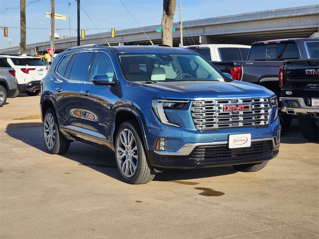 Downpour Metallic 2026 GMC Acadia 4D Sport Utility Denali FWD 8-Speed Automatic 2.5L DOHC Floor Liner Package (1st and 2nd Row All-Weather Floor Liner, 3rd Row All-Weather Floor Liner, and Integrated Cargo Liner), Memory Package, Super Cruise Package (3 Years of OnStar One, Driver Attention Assist, Enhanced Automatic Parking Assist, and Super Cruise), FWD, Sheer/Very Dark Atmosphere Leather, 12 Speakers, 3.49 Final Drive Axle Ratio, 3rd Row 60/40 Power Split-Folding Bench, 3rd row seats: split-bench, 4-Wheel Disc Brakes, 6-Way Power Front Passenger Seat Adjuster, 7-Passenger Seating (2-2-3 Seating Configuration), 8-Way Power Driver Seat Adjuster, ABS brakes, Air Conditioning, Alloy wheels, AM/FM radio: SiriusXM with 360L, Apple CarPlay/Android Auto, Auto High-beam Headlights, Auto-dimming door mirrors, Auto-dimming Rear-View mirror, Automatic temperature control, Bodyside moldings, Bose Premium 12-Speaker System with Sub-Woofer, Brake assist, Bumpers: body-color, Compass, Delay-off headlights, Driver 4-Way Power Lumbar Seat Adjuster, Driver door bin, Driver vanity mirror, Dual front impact airbags, Dual front side impact airbags, Electronic Stability Control, Emergency communication system: OnStar Services capable, Exterior Parking Camera Rear, Four wheel independent suspension, Front anti-roll bar, Front Bucket Seats, Front Center Armrest, Front dual zone A/C, Front fog lights, Front Passenger 4-Way Power Lumbar Seat Adjuster, Front reading lights, Fully automatic headlights, Garage door transmitter, Genuine wood console insert, Genuine wood dashboard insert, Genuine wood door panel insert, Heads-Up Display, Heated and Ventilated Driver and Front Passenger Seats, Heated door mirrors, Heated Driver and Front Passenger Seats, Heated front seats, Heated rear seats, Heated steering wheel, Illuminated entry, Leather steering wheel, Low tire pressure warning, Memory seat, Navigation System, Occupant sensing airbag, Outside temperature display, Overhead airbag, Overhead console, Panic alarm, Panoramic Power Sunroof with Sunshade, Passenger door bin, Passenger vanity mirror, Perforated Leather-Appointed Seat Trim, Performance Suspension, Power door mirrors, Power driver seat, Power Liftgate, Power passenger seat, Power steering, Power windows, Radio data system, Radio: 15 Diagonal Premium GMC Infotainment System, Rain sensing wipers, Rear air conditioning, Rear anti-roll bar, Rear reading lights, Rear side impact airbag, Rear window defroster, Rear window wiper, Remote keyless entry, Security system, SiriusXM with 360L, Speed control, Speed-sensing steering, Split folding rear seat, Spoiler, Sport steering wheel, Steering wheel memory, Steering wheel mounted audio controls, Tachometer, Telescoping steering wheel, Tilt steering wheel, Traction control, Trip computer, Turn signal indicator mirrors, Variably intermittent wipers, Ventilated front seats, Voltmeter, Wheels: 20 x 8 Pearl Nickel Machined Aluminum, and Wheels: 22 x 8.5 Pearl Nickel Machined Aluminum.