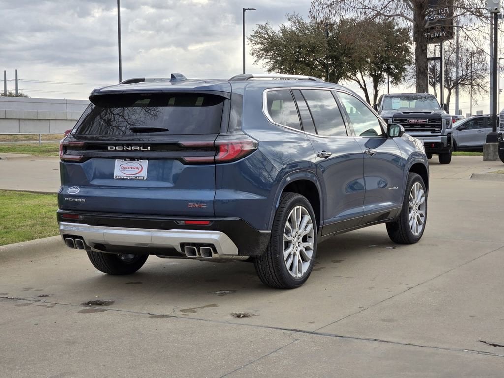 Downpour Metallic 2026 GMC Acadia 4D Sport Utility Denali FWD 8-Speed Automatic 2.5L DOHC Floor Liner Package (1st and 2nd Row All-Weather Floor Liner, 3rd Row All-Weather Floor Liner, and Integrated Cargo Liner), Memory Package, Super Cruise Package (3 Years of OnStar One, Driver Attention Assist, Enhanced Automatic Parking Assist, and Super Cruise), FWD, Sheer/Very Dark Atmosphere Leather, 12 Speakers, 3.49 Final Drive Axle Ratio, 3rd Row 60/40 Power Split-Folding Bench, 3rd row seats: split-bench, 4-Wheel Disc Brakes, 6-Way Power Front Passenger Seat Adjuster, 7-Passenger Seating (2-2-3 Seating Configuration), 8-Way Power Driver Seat Adjuster, ABS brakes, Air Conditioning, Alloy wheels, AM/FM radio: SiriusXM with 360L, Apple CarPlay/Android Auto, Auto High-beam Headlights, Auto-dimming door mirrors, Auto-dimming Rear-View mirror, Automatic temperature control, Bodyside moldings, Bose Premium 12-Speaker System with Sub-Woofer, Brake assist, Bumpers: body-color, Compass, Delay-off headlights, Driver 4-Way Power Lumbar Seat Adjuster, Driver door bin, Driver vanity mirror, Dual front impact airbags, Dual front side impact airbags, Electronic Stability Control, Emergency communication system: OnStar Services capable, Exterior Parking Camera Rear, Four wheel independent suspension, Front anti-roll bar, Front Bucket Seats, Front Center Armrest, Front dual zone A/C, Front fog lights, Front Passenger 4-Way Power Lumbar Seat Adjuster, Front reading lights, Fully automatic headlights, Garage door transmitter, Genuine wood console insert, Genuine wood dashboard insert, Genuine wood door panel insert, Heads-Up Display, Heated and Ventilated Driver and Front Passenger Seats, Heated door mirrors, Heated Driver and Front Passenger Seats, Heated front seats, Heated rear seats, Heated steering wheel, Illuminated entry, Leather steering wheel, Low tire pressure warning, Memory seat, Navigation System, Occupant sensing airbag, Outside temperature display, Overhead airbag, Overhead console, Panic alarm, Panoramic Power Sunroof with Sunshade, Passenger door bin, Passenger vanity mirror, Perforated Leather-Appointed Seat Trim, Performance Suspension, Power door mirrors, Power driver seat, Power Liftgate, Power passenger seat, Power steering, Power windows, Radio data system, Radio: 15 Diagonal Premium GMC Infotainment System, Rain sensing wipers, Rear air conditioning, Rear anti-roll bar, Rear reading lights, Rear side impact airbag, Rear window defroster, Rear window wiper, Remote keyless entry, Security system, SiriusXM with 360L, Speed control, Speed-sensing steering, Split folding rear seat, Spoiler, Sport steering wheel, Steering wheel memory, Steering wheel mounted audio controls, Tachometer, Telescoping steering wheel, Tilt steering wheel, Traction control, Trip computer, Turn signal indicator mirrors, Variably intermittent wipers, Ventilated front seats, Voltmeter, Wheels: 20 x 8 Pearl Nickel Machined Aluminum, and Wheels: 22 x 8.5 Pearl Nickel Machined Aluminum.