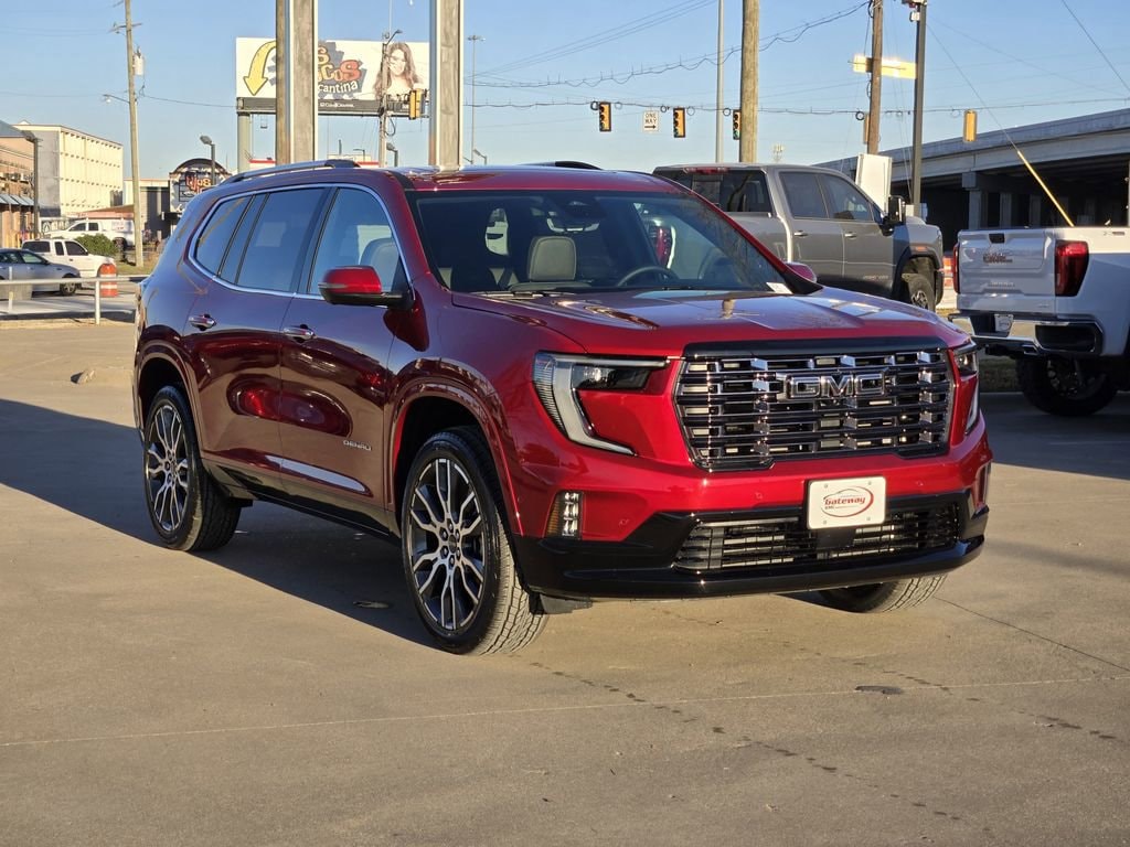 Volcanic Red Tintcoat 2026 GMC Acadia 4D Sport Utility Denali Ultimate AWD 8-Speed Automatic 2.5L DOHC Memory Package, AWD, Woodland Mahogany Leather, 16 Speakers, 3.49 Final Drive Axle Ratio, 3rd Row 60/40 Power Split-Folding Bench, 3rd row seats: split-bench, 4-Wheel Disc Brakes, 6-Way Power Front Passenger Seat Adjuster, 7-Passenger Seating (2-2-3 Seating Configuration), 8-Way Power Driver Seat Adjuster, ABS brakes, Air Conditioning, Alloy wheels, AM/FM radio: SiriusXM with 360L, Apple CarPlay/Android Auto, Auto High-beam Headlights, Auto-dimming door mirrors, Automatic temperature control, Bodyside moldings, Brake assist, Bumpers: body-color, Compass, Delay-off headlights, Driver 4-Way Power Lumbar Seat Adjuster, Driver door bin, Driver Power Massage Seat, Driver vanity mirror, Dual front impact airbags, Dual front side impact airbags, Electronic Stability Control, Emergency communication system: OnStar Services capable, Exterior Parking Camera Rear, Four wheel independent suspension, Front anti-roll bar, Front Bucket Seats, Front Center Armrest, Front dual zone A/C, Front fog lights, Front Passenger 4-Way Power Lumbar Seat Adjuster, Front Passenger Power Massage Seat, Front reading lights, Full Leather Seat Trim, Fully automatic headlights, Garage door transmitter, Genuine wood console insert, Genuine wood dashboard insert, Genuine wood door panel insert, Heads-Up Display, Heated door mirrors, Heated front seats, Heated rear seats, Heated steering wheel, Illuminated entry, Leather steering wheel, Low tire pressure warning, Memory seat, Navigation System, Occupant sensing airbag, Outside temperature display, Overhead airbag, Overhead console, Panic alarm, Passenger door bin, Passenger vanity mirror, Power door mirrors, Power driver seat, Power Liftgate, Power moonroof, Power passenger seat, Power steering, Power windows, Radio data system, Rain sensing wipers, Rear air conditioning, Rear anti-roll bar, Rear reading lights, Rear side impact airbag, Rear window defroster, Rear window wiper, Remote keyless entry, Security system, Speed control, Speed-sensing steering, Split folding rear seat, Spoiler, Sport steering wheel, Steering wheel memory, Steering wheel mounted audio controls, Tachometer, Telescoping steering wheel, Tilt steering wheel, Traction control, Trip computer, Turn signal indicator mirrors, Variably intermittent wipers, Ventilated front seats, Voltmeter, and Wheels: 22 x 8.5 After Midnight Machined Aluminum.