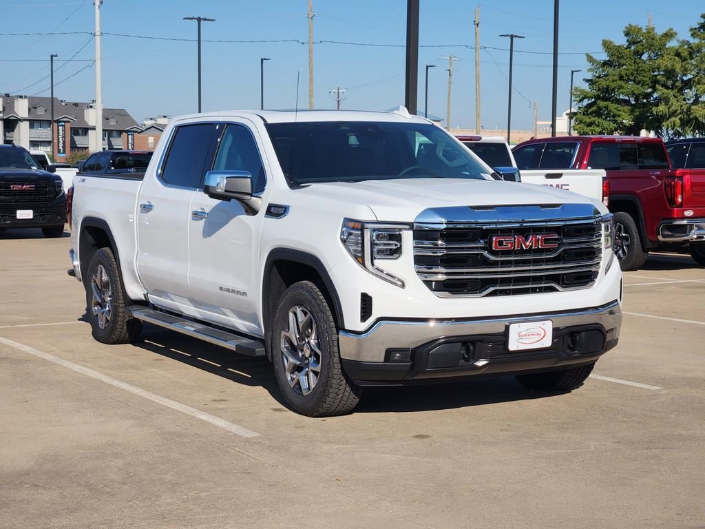 Summit White 2026 GMC Sierra 1500 4D Crew Cab SLT 4WD 10-Speed Automatic EcoTec3 5.3L V8 High Capacity Suspension Package, Preferred Equipment Group 4SA (120-Volt Bed Mounted Power Outlet, 120-Volt Interior Power Outlet, 170 Amp Alternator, 2 Charge/Data USB Ports, 2 Type-C Charge-Only Rear USB Ports, 6-Speaker Audio System Feature, Auto-Locking Rear Differential, Auxiliary External Transmission Oil Cooler, Chrome Header & Chrome Grille Insert Bars, Color-Keyed Carpeting Floor Covering, Deep-Tinted Glass, Electric Rear-Window Defogger, Front Frame-Mounted Black Recovery Hooks, Front Rain-Sensing Wipers, HD Rear Vision Camera, Integrated Trailer Brake Controller, Keyless Open & Start, LED Cargo Area Lighting, Manual Tilt-Wheel & Telescoping Steering Column, OnStar Services Capable, Perimeter Lighting, Power Door Locks, Power Front Passenger Windows w/Express Up/Down, Power Front Windows w/Driver Express Up/Down, Power Rear Windows w/Express Down, Push Button Start, Rear Wheelhouse Liners, Remote Vehicle Starter System, SiriusXM w/360L Trial Subscription, Steering Wheel Audio Controls, Theft Deterrent System (Unauthorized Entry), and Wi-Fi Hotspot Capable), SLT Convenience Package (2 Charge/Data USB Ports Inside Center Console, Electronic Precision Shift, Floor-Mounted Center Console, Front Bucket Seats, Power Rake & Telescoping Steering Column, Premium Bose 7-Speaker Sound System, Ventilated Driver & Front Passenger Seats, and Wireless Charging), SLT Preferred Package (Adaptive Cruise Control, Heated 2nd Row Outboard Seats, Power Sliding Rear Window w/Rear Defogger, and Universal Home Remote), Standard Suspension Package, Texas Edition SLT Premium Package (20 Polished Aluminum Wheels, Chrome Wheel To Wheel Assist Steps, and Texas Edition Badging), Trailering Package (Hitch Guidance), X31 Off-Road Package (Dual Exhaust System, Heavy-Duty Air Filter, Hill Descent Control, Off-Road Suspension, and X31 Hard Badge), 10-Speed Automatic, 4WD, Black Leather, 10-Way Power Driver Seat Adjuster w/Lumbar, 10-Way Power Passenger Seat Adjuster w/Lumbar, 3 Years SiriusXM, 3.23 Rear Axle Ratio, 4-Wheel Disc Brakes, 6 Speakers, ABS brakes, Air Conditioning, All-Weather Floor Liner (LPO), Alloy wheels, AM/FM radio: SiriusXM with 360L, Apple CarPlay/Android Auto, Auto High-beam Headlights, Auto-dimming door mirrors, Auto-dimming Rear-View mirror, Automatic Emergency Braking, Automatic temperature control, Brake assist, Buckle to Drive, Bumpers: chrome, Compass, Delay-off headlights, Driver door bin, Driver Memory, Driver vanity mirror, Dual front impact airbags, Dual front side impact airbags, Electronic Stability Control, Emergency communication system: OnStar, Following Distance Indicator, Forward Collision Alert, Front 40/20/40 Split-Bench Seat, Front anti-roll bar, Front Center Armrest w/Storage, Front dual zone A/C, Front fog lights, Front License Plate Kit, Front Pedestrian Braking, Front reading lights, Front wheel independent suspension, Fully automatic headlights, Heated door mirrors, Heated Driver & Front Outboard Passenger Seating, Heated front seats, Heated steering wheel, Illuminated entry, IntelliBeam Automatic High Beam On/Off, Lane Keep Assist w/Lane Departure Warning, Low tire pressure warning, Memory seat, Navigation System, Occupant sensing airbag, Outside temperature display, Overhead airbag, Overhead console, Panic alarm, Passenger door bin, Passenger vanity mirror, Perf Leather-Appointed Front Outboard Seat Trim, Power door mirrors, Power driver seat, Power passenger seat, Power steering, Power Sunroof, Power windows, Radio data system, Radio: Premium GMC Infotainment Audio System, Rain sensing wipers, Rear reading lights, Rear seat center armrest, Rear step bumper, Rear window defroster, Remote keyless entry, Security system, Speed control, Speed-sensing steering, Split folding rear seat, Steering wheel mounted audio controls, Tachometer, Telescoping steering wheel, Tilt ste