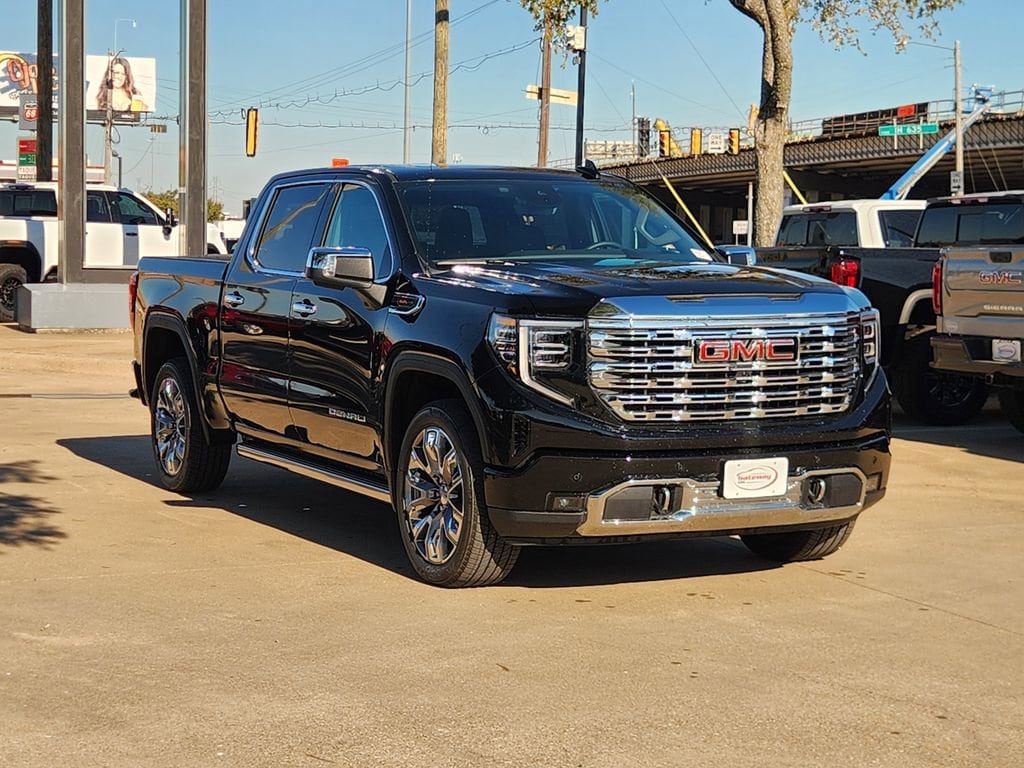 Onyx Black 2026 GMC Sierra 1500 4D Crew Cab Denali 4WD 10-Speed Automatic EcoTec3 6.2L V8 Denali Reserve Package (GMC MultiPro Power Steps, Power Sunroof, and Wheels: 22 x 9 Painted Aluminum), Preferred Equipment Group 5SA (120-Volt Bed Mounted Power Outlet, 120-Volt Interior Power Outlet, 170 Amp Alternator, 2 Charge/Data USB Ports Inside Center Console, 2 Type-C Charge-Only Rear USB Ports, 2 USB Ports, Auto-Locking Rear Differential, Auxiliary External Transmission Oil Cooler, Bed View Camera, Chrome Recovery Hooks, Color-Keyed Carpeting Floor Covering, Deep-Tinted Glass, Electric Rear-Window Defogger, Floor-Mounted Center Console, Front Rain-Sensing Wipers, HD Surround Vision, Heated 2nd Row Outboard Seats, Heavy-Duty Air Filter, Hill Descent Control, Hitch View, Integrated Trailer Brake Controller, LED Cargo Area Lighting, OnStar Services Capable, Perimeter Lighting, Power Door Locks, Premium Bose 7-Speaker Sound System, Push Button Start, Rear Cross Traffic Braking, Rear Pedestrian Detection, Rear Wheelhouse Liners, Remote Vehicle Starter System, Steering Wheel Audio Controls, Trailer Camera Provisions, Trailer Side Blind Zone Alert, Universal Home Remote, Wi-Fi Hotspot Capable, and Wireless Charging), Technology Package (Multicolor 15 Diagonal Head-Up Display and Rear Camera Mirror), Trailering Package (Hitch Guidance), 10-Speed Automatic, 4WD, Black Leather, 3.23 Rear Axle Ratio, 4-Wheel Disc Brakes, 7 Speakers, ABS brakes, Adaptive suspension, Air Conditioning, Alloy wheels, AM/FM radio: SiriusXM with 360L, Apple CarPlay/Android Auto, Auto High-beam Headlights, Auto-dimming door mirrors, Auto-dimming Rear-View mirror, Automatic temperature control, Brake assist, Buckle to Drive, Bumpers: body-color, Compass, Delay-off headlights, Driver door bin, Driver Memory, Driver vanity mirror, Dual Active Exhaust, Dual front impact airbags, Dual front side impact airbags, Electronic Stability Control, Emergency communication system: OnStar, Enhanced Automatic Emergency Braking, Following Distance Indicator, Forge Perforated Leather Seat Trim, Forward Collision Alert, Front anti-roll bar, Front Bucket Seats, Front Center Armrest, Front dual zone A/C, Front fog lights, Front License Plate Kit, Front Pedestrian Braking, Front reading lights, Front wheel independent suspension, Fully automatic headlights, Garage door transmitter, Genuine wood console insert, Genuine wood dashboard insert, Genuine wood door panel insert, Heated door mirrors, Heated front seats, Heated rear seats, Heated steering wheel, Illuminated entry, Low tire pressure warning, Memory seat, Navigation System, Occupant sensing airbag, Outside temperature display, Overhead airbag, Overhead console, Panic alarm, Passenger door bin, Passenger vanity mirror, Power door mirrors, Power driver seat, Power passenger seat, Power steering, Power windows, Radio data system, Radio: Premium GMC Infotainment Audio System, Rain sensing wipers, Rear reading lights, Rear seat center armrest, Rear step bumper, Rear window defroster, Remote keyless entry, Safety Alert Seat, Security system, Speed control, Speed-sensing steering, Split folding rear seat, Steering wheel mounted audio controls, Tachometer, Telescoping steering wheel, Tilt steering wheel, Traction control, Trip computer, Variably intermittent wipers, Ventilated front seats, Voltmeter, and Wireless Apple CarPlay/Wireless Android Auto.
