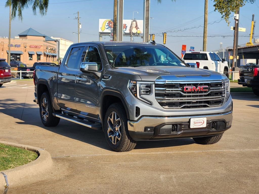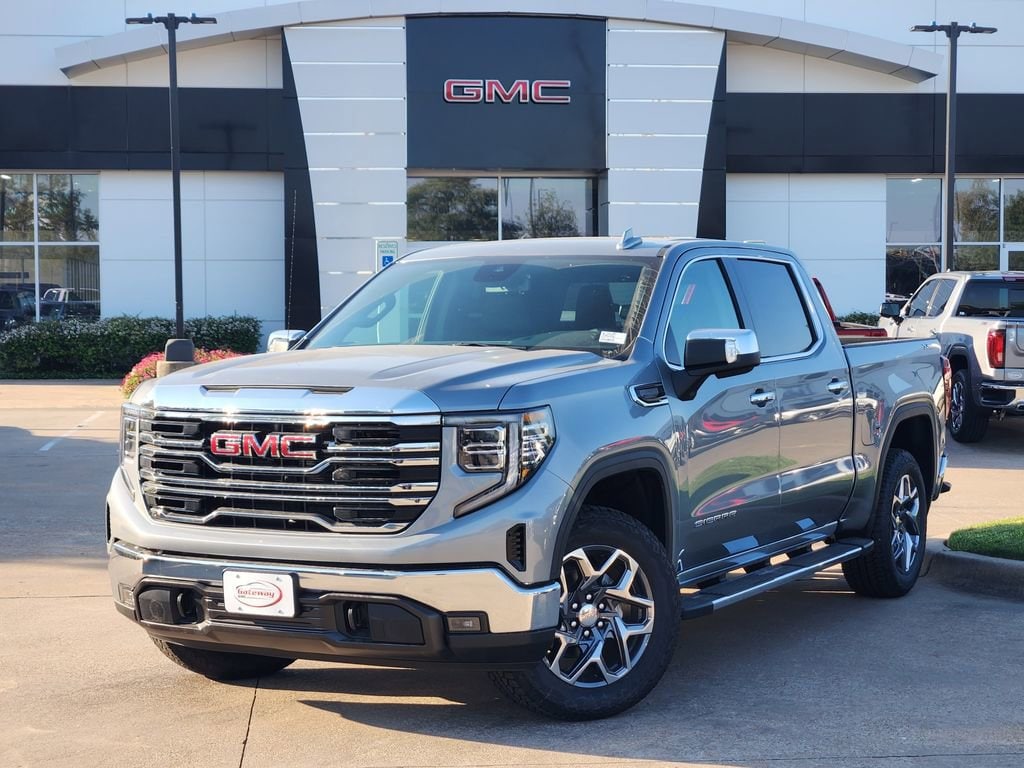 Sterling Metallic 2026 GMC Sierra 1500 4D Crew Cab SLT 4WD 10-Speed Automatic EcoTec3 5.3L V8 High Capacity Suspension Package, Preferred Equipment Group 4SA (120-Volt Bed Mounted Power Outlet, 120-Volt Interior Power Outlet, 170 Amp Alternator, 2 Charge/Data USB Ports, 2 Type-C Charge-Only Rear USB Ports, 6-Speaker Audio System Feature, Auto-Locking Rear Differential, Auxiliary External Transmission Oil Cooler, Color-Keyed Carpeting Floor Covering, Deep-Tinted Glass, Driver Memory, Electric Rear-Window Defogger, Front 40/20/40 Split-Bench Seat, Front Frame-Mounted Black Recovery Hooks, Front Rain-Sensing Wipers, HD Rear Vision Camera, Integrated Trailer Brake Controller, LED Cargo Area Lighting, OnStar Services Capable, Perimeter Lighting, Power Door Locks, Push Button Start, Rear Wheelhouse Liners, Remote Vehicle Starter System, Steering Wheel Audio Controls, Wheels: 18 x 8.5 6-Spoke Machined Aluminum, and Wi-Fi Hotspot Capable), SLT Convenience Package (2 Charge/Data USB Ports Inside Center Console, Electronic Precision Shift, Floor-Mounted Center Console, Front Bucket Seats, Premium Bose 7-Speaker Sound System, and Wireless Charging), SLT Preferred Package (Adaptive Cruise Control, Heated 2nd Row Outboard Seats, and Universal Home Remote), Standard Suspension Package, Texas Edition SLT Premium Package (20 Polished Aluminum Wheels and Texas Edition Badging), Trailering Package (Hitch Guidance), X31 Off-Road Package (Dual Exhaust System, Heavy-Duty Air Filter, Hill Descent Control, Off-Road Suspension, and X31 Hard Badge), 10-Speed Automatic, 4WD, Black Leather, 3 Years SiriusXM, 3.23 Rear Axle Ratio, 4-Wheel Disc Brakes, 6 Speakers, ABS brakes, Air Conditioning, Alloy wheels, AM/FM radio: SiriusXM with 360L, Apple CarPlay/Android Auto, Auto High-beam Headlights, Auto-dimming door mirrors, Auto-dimming Rear-View mirror, Automatic Emergency Braking, Automatic temperature control, Brake assist, Buckle to Drive, Bumpers: chrome, Compass, Delay-off headlights, Driver door bin, Driver vanity mirror, Dual front impact airbags, Dual front side impact airbags, Electronic Stability Control, Emergency communication system: OnStar, Following Distance Indicator, Forward Collision Alert, Front anti-roll bar, Front Center Armrest w/Storage, Front dual zone A/C, Front fog lights, Front License Plate Kit, Front Pedestrian Braking, Front reading lights, Front wheel independent suspension, Fully automatic headlights, Heated door mirrors, Heated front seats, Heated steering wheel, Illuminated entry, Low tire pressure warning, Memory seat, Navigation System, Occupant sensing airbag, Outside temperature display, Overhead airbag, Overhead console, Panic alarm, Passenger door bin, Passenger vanity mirror, Power door mirrors, Power driver seat, Power passenger seat, Power steering, Power windows, Radio data system, Radio: Premium GMC Infotainment Audio System, Rain sensing wipers, Rear reading lights, Rear seat center armrest, Rear step bumper, Rear window defroster, Remote keyless entry, Security system, Speed control, Speed-sensing steering, Split folding rear seat, Steering wheel mounted audio controls, Tachometer, Telescoping steering wheel, Tilt steering wheel, Traction control, Trip computer, Variably intermittent wipers, Voltmeter, and Wireless Apple CarPlay/Wireless Android Auto.