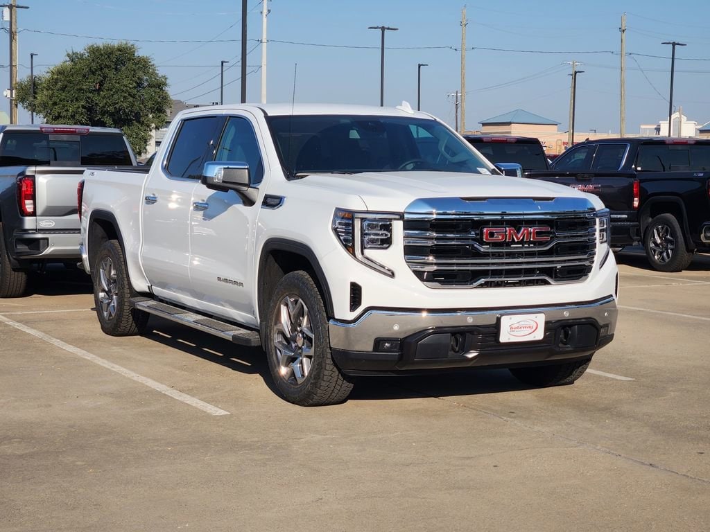 Summit White 2026 GMC Sierra 1500 4D Crew Cab SLT 4WD 10-Speed Automatic EcoTec3 5.3L V8 High Capacity Suspension Package, Preferred Equipment Group 4SA (120-Volt Bed Mounted Power Outlet, 120-Volt Interior Power Outlet, 170 Amp Alternator, 2 Charge/Data USB Ports, 2 Type-C Charge-Only Rear USB Ports, 6-Speaker Audio System Feature, Auto-Locking Rear Differential, Auxiliary External Transmission Oil Cooler, Color-Keyed Carpeting Floor Covering, Deep-Tinted Glass, Electric Rear-Window Defogger, Front Frame-Mounted Black Recovery Hooks, Front Rain-Sensing Wipers, HD Rear Vision Camera, Integrated Trailer Brake Controller, LED Cargo Area Lighting, OnStar Services Capable, Perimeter Lighting, Power Door Locks, Push Button Start, Rear Wheelhouse Liners, Remote Vehicle Starter System, Steering Wheel Audio Controls, and Wi-Fi Hotspot Capable), ProGrade Trailering System (Hitch View), Sierra Safety Plus Package (HD Surround Vision, Rear Cross Traffic Braking, Rear Pedestrian Detection, Safety Alert Seat, Trailer Camera Provisions, and Trailer Side Blind Zone Alert), SLT Convenience Package (2 Charge/Data USB Ports Inside Center Console, Electronic Precision Shift, Floor-Mounted Center Console, Front Bucket Seats, Premium Bose 7-Speaker Sound System, and Wireless Charging), SLT Preferred Package (Adaptive Cruise Control, Heated 2nd Row Outboard Seats, and Universal Home Remote), Standard Suspension Package, Texas Edition SLT Premium Plus Package (20 Polished Aluminum Wheels and Texas Edition Badging), Trailering Package (Hitch Guidance), X31 Off-Road Package (Dual Exhaust System, Heavy-Duty Air Filter, Hill Descent Control, Off-Road Suspension, and X31 Hard Badge), 10-Speed Automatic, 4WD, Black Leather, 3 Years SiriusXM, 3.23 Rear Axle Ratio, 4-Wheel Disc Brakes, 6 Speakers, ABS brakes, Air Conditioning, All-Weather Floor Liner (LPO), Alloy wheels, AM/FM radio: SiriusXM with 360L, Apple CarPlay/Android Auto, Auto High-beam Headlights, Auto-dimming door mirrors, Auto-dimming Rear-View mirror, Automatic Emergency Braking, Automatic temperature control, Brake assist, Buckle to Drive, Bumpers: chrome, Chrome Header & Chrome Grille Insert Bars, Chrome Wheel To Wheel Assist Steps, Compass, Delay-off headlights, Driver door bin, Driver Memory, Driver vanity mirror, Dual front impact airbags, Dual front side impact airbags, Electronic Stability Control, Emergency communication system: OnStar, Following Distance Indicator, Forward Collision Alert, Front 40/20/40 Split-Bench Seat, Front anti-roll bar, Front Center Armrest w/Storage, Front dual zone A/C, Front fog lights, Front License Plate Kit, Front Pedestrian Braking, Front reading lights, Front wheel independent suspension, Fully automatic headlights, Heated door mirrors, Heated front seats, Heated steering wheel, Illuminated entry, In-Vehicle Trailering System App, Low tire pressure warning, Manual Tilt-Wheel & Telescoping Steering Column, Memory seat, Navigation System, Occupant sensing airbag, Outside temperature display, Overhead airbag, Overhead console, Panic alarm, Passenger door bin, Passenger vanity mirror, Perf Leather-Appointed Front Outboard Seat Trim, Power door mirrors, Power driver seat, Power Front Passenger Windows w/Express Up/Down, Power passenger seat, Power Rake & Telescoping Steering Column, Power steering, Power windows, Radio data system, Radio: Premium GMC Infotainment Audio System, Rain sensing wipers, Rear reading lights, Rear seat center armrest, Rear step bumper, Rear window defroster, Remote keyless entry, Security system, Speed control, Speed-sensing steering, Split folding rear seat, Spray-On Pickup Bedliner w/GMC Logo, Steering wheel mounted audio controls, Tachometer, Telescoping steering wheel, Theft Deterrent System (Unauthorized Entry), Tilt steering wheel, Traction control, Trip computer, Ultrasonic Front & Rear Park Assist, Variably intermittent wipers, Ventilated Driver & Front Passenger Seats, Voltmet