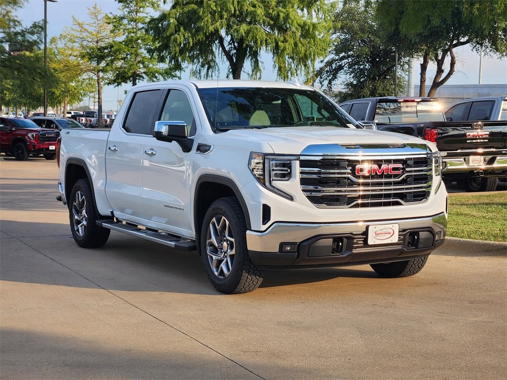 Summit White 2026 GMC Sierra 1500 4D Crew Cab SLT 4WD 10-Speed Automatic EcoTec3 5.3L V8 High Capacity Suspension Package, Preferred Equipment Group 4SA (120-Volt Bed Mounted Power Outlet, 120-Volt Interior Power Outlet, 170 Amp Alternator, 2 Charge/Data USB Ports, 2 Type-C Charge-Only Rear USB Ports, 6-Speaker Audio System Feature, Auto-Locking Rear Differential, Auxiliary External Transmission Oil Cooler, Chrome Header & Chrome Grille Insert Bars, Color-Keyed Carpeting Floor Covering, Deep-Tinted Glass, Electric Rear-Window Defogger, Front Frame-Mounted Black Recovery Hooks, Front Rain-Sensing Wipers, HD Rear Vision Camera, Integrated Trailer Brake Controller, Keyless Open & Start, LED Cargo Area Lighting, Manual Tilt-Wheel & Telescoping Steering Column, OnStar Services Capable, Perimeter Lighting, Power Door Locks, Power Front Passenger Windows w/Express Up/Down, Power Front Windows w/Driver Express Up/Down, Power Rear Windows w/Express Down, Push Button Start, Rear Wheelhouse Liners, Remote Vehicle Starter System, SiriusXM w/360L Trial Subscription, Steering Wheel Audio Controls, Theft Deterrent System (Unauthorized Entry), and Wi-Fi Hotspot Capable), SLT Convenience Package (2 Charge/Data USB Ports Inside Center Console, Electronic Precision Shift, Floor-Mounted Center Console, Front Bucket Seats, Power Rake & Telescoping Steering Column, Premium Bose 7-Speaker Sound System, Ventilated Driver & Front Passenger Seats, and Wireless Charging), SLT Preferred Package (Adaptive Cruise Control, Heated 2nd Row Outboard Seats, Power Sliding Rear Window w/Rear Defogger, and Universal Home Remote), Standard Suspension Package, Texas Edition SLT Premium Package (20 Polished Aluminum Wheels, Chrome Wheel To Wheel Assist Steps, and Texas Edition Badging), Trailering Package (Hitch Guidance), X31 Off-Road Package (Dual Exhaust System, Heavy-Duty Air Filter, Hill Descent Control, Off-Road Suspension, and X31 Hard Badge), 10-Speed Automatic, 4WD, Dark Walnut/Slate Leather, 10-Way Power Driver Seat Adjuster w/Lumbar, 10-Way Power Passenger Seat Adjuster w/Lumbar, 3.23 Rear Axle Ratio, 4-Wheel Disc Brakes, 6 Speakers, ABS brakes, Air Conditioning, All-Weather Floor Liner (LPO), Alloy wheels, AM/FM radio: SiriusXM with 360L, Apple CarPlay/Android Auto, Auto High-beam Headlights, Auto-dimming door mirrors, Auto-dimming Rear-View mirror, Automatic Emergency Braking, Automatic temperature control, Brake assist, Buckle to Drive, Bumpers: chrome, Compass, Delay-off headlights, Driver door bin, Driver Memory, Driver vanity mirror, Dual front impact airbags, Dual front side impact airbags, Electronic Stability Control, Emergency communication system: OnStar, Following Distance Indicator, Forward Collision Alert, Front 40/20/40 Split-Bench Seat, Front anti-roll bar, Front Center Armrest w/Storage, Front dual zone A/C, Front fog lights, Front License Plate Kit, Front Pedestrian Braking, Front reading lights, Front wheel independent suspension, Fully automatic headlights, Heated door mirrors, Heated Driver & Front Outboard Passenger Seating, Heated front seats, Heated steering wheel, Illuminated entry, IntelliBeam Automatic High Beam On/Off, Lane Keep Assist w/Lane Departure Warning, Low tire pressure warning, Memory seat, Navigation System, Occupant sensing airbag, Outside temperature display, Overhead airbag, Overhead console, Panic alarm, Passenger door bin, Passenger vanity mirror, Perf Leather-Appointed Front Outboard Seat Trim, Power door mirrors, Power driver seat, Power passenger seat, Power steering, Power windows, Radio data system, Radio: Premium GMC Infotainment Audio System, Rain sensing wipers, Rear reading lights, Rear seat center armrest, Rear step bumper, Rear window defroster, Remote keyless entry, Security system, Speed control, Speed-sensing steering, Split folding rear seat, Steering wheel mounted audio controls, Tachometer, Telescoping steering wheel, Tilt steering wheel, Traction