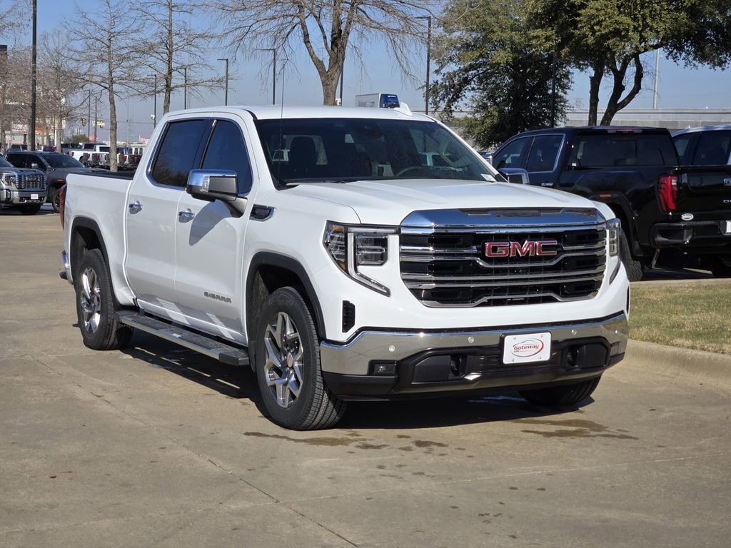 Summit White 2026 GMC Sierra 1500 4D Crew Cab SLT RWD 10-Speed Automatic EcoTec3 5.3L V8 High Capacity Suspension Package, Preferred Equipment Group 4SA (10-Way Power Driver Seat Adjuster with Lumbar, 10-Way Power Passenger Seat Adjuster with Lumbar, 120-Volt Bed Mounted Power Outlet, 120-Volt Interior Power Outlet, 170 Amp Alternator, 2 Charge/Data USB Ports, 2 Type-C Charge-Only Rear USB Ports, 6-Speaker Audio System Feature, Auto-Locking Rear Differential, Auxiliary External Transmission Oil Cooler, Chrome Header and Chrome Grille Insert Bars, Color-Keyed Carpeting Floor Covering, Deep-Tinted Glass, Driver Memory, Electric Rear-Window Defogger, Front 40/20/40 Split-Bench Seat, Front Frame-Mounted Black Recovery Hooks, Front Rain-Sensing Wipers, HD Rear Vision Camera, Heated Driver and Front Outboard Passenger Seating, Integrated Trailer Brake Controller, Keyless Open and Start, LED Cargo Area Lighting, Manual Tilt-Wheel and Telescoping Steering Column, OnStar Services Capable, Perimeter Lighting, Power Door Locks, Power Front Passenger Windows with Express Up/Down, Power Front Windows with Driver Express Up/Down, Power Rear Windows with Express Down, Push Button Start, Rear Wheelhouse Liners, Remote Vehicle Starter System, SiriusXM with 360L Trial Subscription, Steering Wheel Audio Controls, Theft Deterrent System (unauthorized Entry), Wheels: 18 x 8.5 6-Spoke Machined Aluminum, and Wi-Fi Hotspot Capable), ProGrade Trailering System (Hitch View and in-Vehicle Trailering System App), Sierra Safety Plus Package (HD Surround Vision, Rear Cross Traffic Braking, Rear Pedestrian Detection, Safety Alert Seat, Trailer Camera Provisions, Trailer Side Blind Zone Alert, and Ultrasonic Front and Rear Park Assist), SLT Convenience Package (2 Charge/Data USB Ports Inside Center Console, Electronic Precision Shift, Floor-Mounted Center Console, Front Bucket Seats, Power Rake and Telescoping Steering Column, Premium Bose 7-Speaker Sound System, Ventilated Driver and Front Passenger Seats, and Wireless Charging), SLT Preferred Package (Adaptive Cruise Control, Heated 2nd Row Outboard Seats, Power Sliding Rear Window with Rear Defogger, and Universal Home Remote), Standard Suspension Package, Texas Edition SLT Premium Plus Package (20 Polished Aluminum Wheels, Chrome Wheel to Wheel Assist Steps, Spray-on Pickup Bedliner with GMC Logo, and Texas Edition Badging), Trailering Package (Hitch Guidance), 10-Speed Automatic, Black Leather, 3.23 Rear Axle Ratio, 4-Wheel Disc Brakes, 6 Speakers, ABS brakes, Air Conditioning, All-Weather Floor Liner, Alloy wheels, AM/FM radio: SiriusXM with 360L, Apple CarPlay/Android Auto, Auto High-beam Headlights, Auto-dimming door mirrors, Auto-dimming Rear-View mirror, Automatic Emergency Braking, Automatic temperature control, Brake assist, Buckle to Drive, Bumpers: chrome, Compass, Delay-off headlights, Driver door bin, Driver vanity mirror, Dual front impact airbags, Dual front side impact airbags, Electronic Stability Control, Emergency communication system: OnStar, Following Distance Indicator, Forward Collision Alert, Front anti-roll bar, Front Center Armrest w/Storage, Front dual zone A/C, Front fog lights, Front License Plate Kit, Front Pedestrian Braking, Front reading lights, Front wheel independent suspension, Fully automatic headlights, Heated door mirrors, Heated front seats, Heated steering wheel, Illuminated entry, IntelliBeam Automatic High Beam on/Off, Lane Keep Assist with Lane Departure Warning, Low tire pressure warning, Memory seat, Navigation System, Occupant sensing airbag, Outside temperature display, Overhead airbag, Overhead console, Panic alarm, Passenger door bin, Passenger vanity mirror, Perforated Leather-Appointed Front Outboard Seat Trim, Power door mirrors, Power driver seat, Power passenger seat, Power steering, Power windows, Radio data system, Radio: Premium GMC Infotainment Audio System, Rain sensing wipers, Rear reading lights