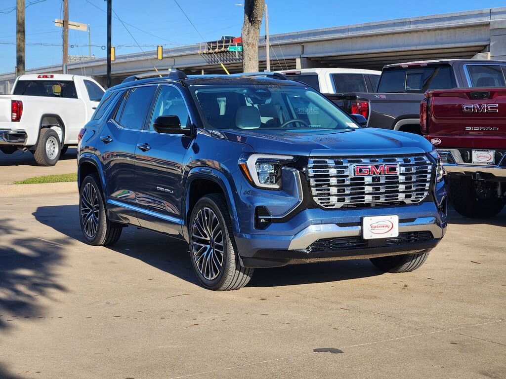 Downpour Metallic 2026 GMC Terrain 4D Sport Utility Denali AWD 8-Speed Automatic with Overdrive 1.5L DOHC Floor Liner Package (LPO) (All-Weather Cargo Mat (LPO), Front All-Weather Floor Liners (LPO), and Second Row All-Weather Mat (LPO)), AWD, 2-Way Power Driver Lumbar Seat Adjuster, 3.47 Final Drive Axle Ratio, 4-Wheel Disc Brakes, 6 Speakers, 6-Speaker Audio System Feature, 8-Way Power Driver Seat Adjuster, ABS brakes, Air Conditioning, Alloy wheels, AM/FM radio: SiriusXM, Auto High-beam Headlights, Automatic temperature control, Brake assist, Bumpers: body-color, Compass, Delay-off headlights, Driver & Front Passenger Heated Seats, Driver door bin, Driver vanity mirror, Dual front impact airbags, Dual front side impact airbags, Ebony Twilight Metallic Roof, Ebony Twilight Mirror Caps, Electronic Stability Control, Emergency communication system: OnStar and GMC connected services capable, Four wheel independent suspension, Front anti-roll bar, Front Bucket Seats, Front Center Armrest, Front dual zone A/C, Front fog lights, Front reading lights, Fully automatic headlights, Garage door transmitter, Heated door mirrors, Heated front seats, Heated rear seats, Heated steering wheel, Illuminated entry, Low tire pressure warning, Memory seat, Navigation System, Occupant sensing airbag, Outside temperature display, Overhead airbag, Overhead console, Panic alarm, Panoramic Power Sunroof w/Sunshade, Passenger door bin, Passenger vanity mirror, Perforated Leather-Appointed Seat Trim, Power door mirrors, Power driver seat, Power Liftgate, Power passenger seat, Power steering, Power windows, Radio data system, Radio: Premium GMC Infotainment System, Rain sensing wipers, Rear air conditioning, Rear anti-roll bar, Rear seat center armrest, Rear window defroster, Rear window wiper, Remote keyless entry, Security system, SiriusXM w/360L Trial Subscription, Speed control, Speed-sensing steering, Split folding rear seat, Spoiler, Sport steering wheel, Steering wheel mounted audio controls, Tachometer, Telescoping steering wheel, Tilt steering wheel, Traction control, Trip computer, Variably intermittent wipers, Ventilated Driver Seat, Ventilated Front Passenger Seat, Ventilated front seats, Wheels: 19 x 7.5 Midnight Silver Aluminum, Wheels: 20 x 8 After Midnight Aluminum, and Wireless Apple CarPlay/Wireless Android Auto.