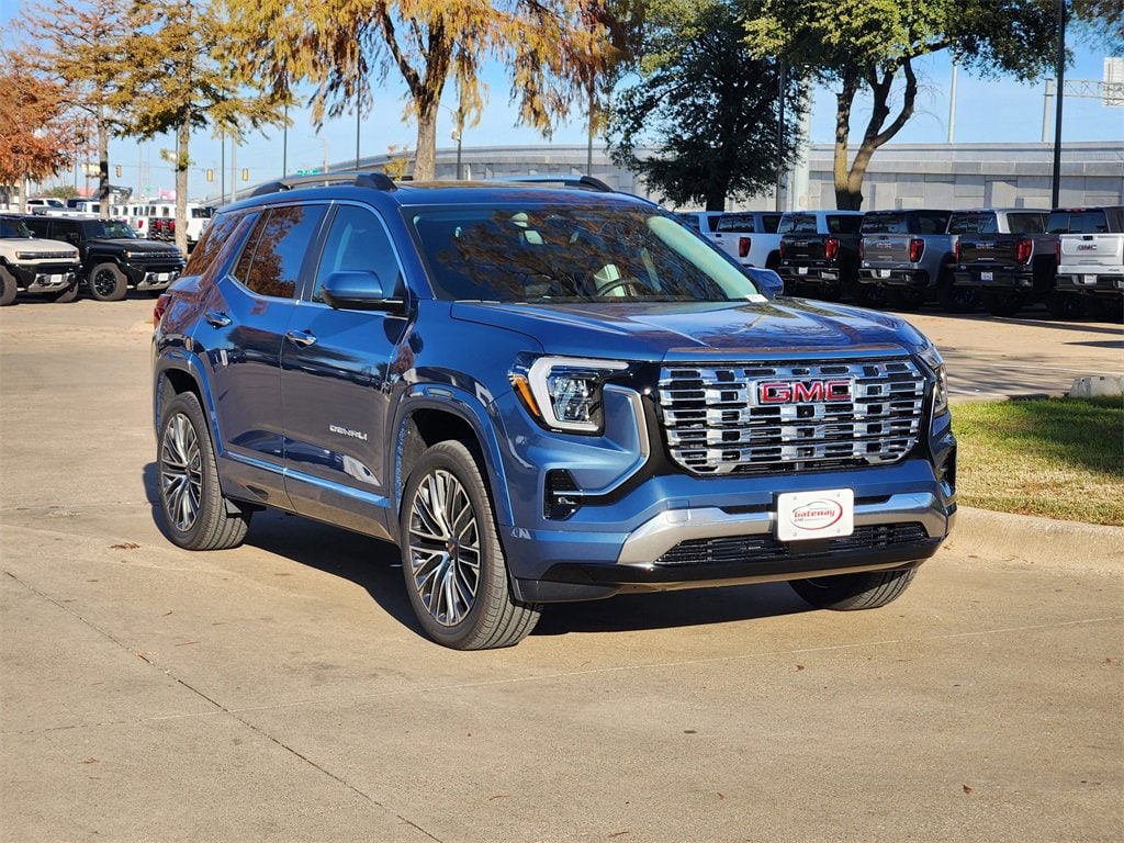 Downpour Metallic 2026 GMC Terrain 4D Sport Utility Denali AWD 8-Speed Automatic with Overdrive 1.5L DOHC Floor Liner Package (LPO) (All-Weather Cargo Mat (LPO), Front All-Weather Floor Liners (LPO), and Second Row All-Weather Mat (LPO)), AWD, 2-Way Power Driver Lumbar Seat Adjuster, 3.47 Final Drive Axle Ratio, 4-Wheel Disc Brakes, 6 Speakers, 6-Speaker Audio System Feature, 8-Way Power Driver Seat Adjuster, ABS brakes, Air Conditioning, Alloy wheels, AM/FM radio: SiriusXM, Auto High-beam Headlights, Automatic temperature control, Brake assist, Bumpers: body-color, Compass, Delay-off headlights, Driver & Front Passenger Heated Seats, Driver door bin, Driver vanity mirror, Dual front impact airbags, Dual front side impact airbags, Electronic Stability Control, Emergency communication system: OnStar and GMC connected services capable, Four wheel independent suspension, Front anti-roll bar, Front Bucket Seats, Front Center Armrest, Front dual zone A/C, Front fog lights, Front reading lights, Fully automatic headlights, Garage door transmitter, Heated door mirrors, Heated front seats, Heated rear seats, Heated steering wheel, Illuminated entry, Low tire pressure warning, Memory seat, Navigation System, Occupant sensing airbag, Outside temperature display, Overhead airbag, Overhead console, Panic alarm, Panoramic Power Sunroof w/Sunshade, Passenger door bin, Passenger vanity mirror, Perforated Leather-Appointed Seat Trim, Power door mirrors, Power driver seat, Power Liftgate, Power passenger seat, Power steering, Power windows, Radio data system, Radio: Premium GMC Infotainment System, Rain sensing wipers, Rear air conditioning, Rear anti-roll bar, Rear seat center armrest, Rear window defroster, Rear window wiper, Remote keyless entry, Security system, SiriusXM w/360L Trial Subscription, Speed control, Speed-sensing steering, Split folding rear seat, Spoiler, Sport steering wheel, Steering wheel mounted audio controls, Tachometer, Telescoping steering wheel, Tilt steering wheel, Traction control, Trip computer, Variably intermittent wipers, Ventilated Driver Seat, Ventilated Front Passenger Seat, Ventilated front seats, Wheels: 19 x 7.5 Midnight Silver Aluminum, Wheels: 20 x 8 After Midnight Aluminum, and Wireless Apple CarPlay/Wireless Android Auto.